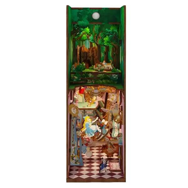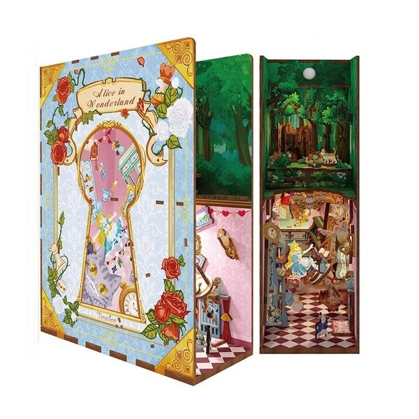 Waarom staan alle meubeltjes scheef in dit miniatuurhuisje? Is dit houten bouwpakket niet zo goed gelukt, wat is er aan de hand? Alles staat expres schots en scheef. We hebben het hier namelijk over een van de belangrijkste scènes uit het sprookje Alice in Wonderland. Lewis Carroll schreef dit avontuur in 1865. En is tijdreizen nu een bekender onderwerp, toentertijd was het waanzinnig. Alice zweeft door de tijd, van scènes van de oneindige teaparty naar het geheimzinnige bos met het witte konijn. Aan jou om deze intrigerende houten 3D-puzzel te bouwen.